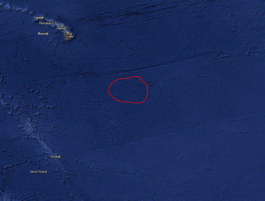 The description would need to modified to south-west, as if you go directly south 'nearly a thousand miles' you end up a lot closer to Kiribati than Hawaii. So, South-West about a thousand miles ends you up somewhere near the Mahi Mahi Fracture Zone.